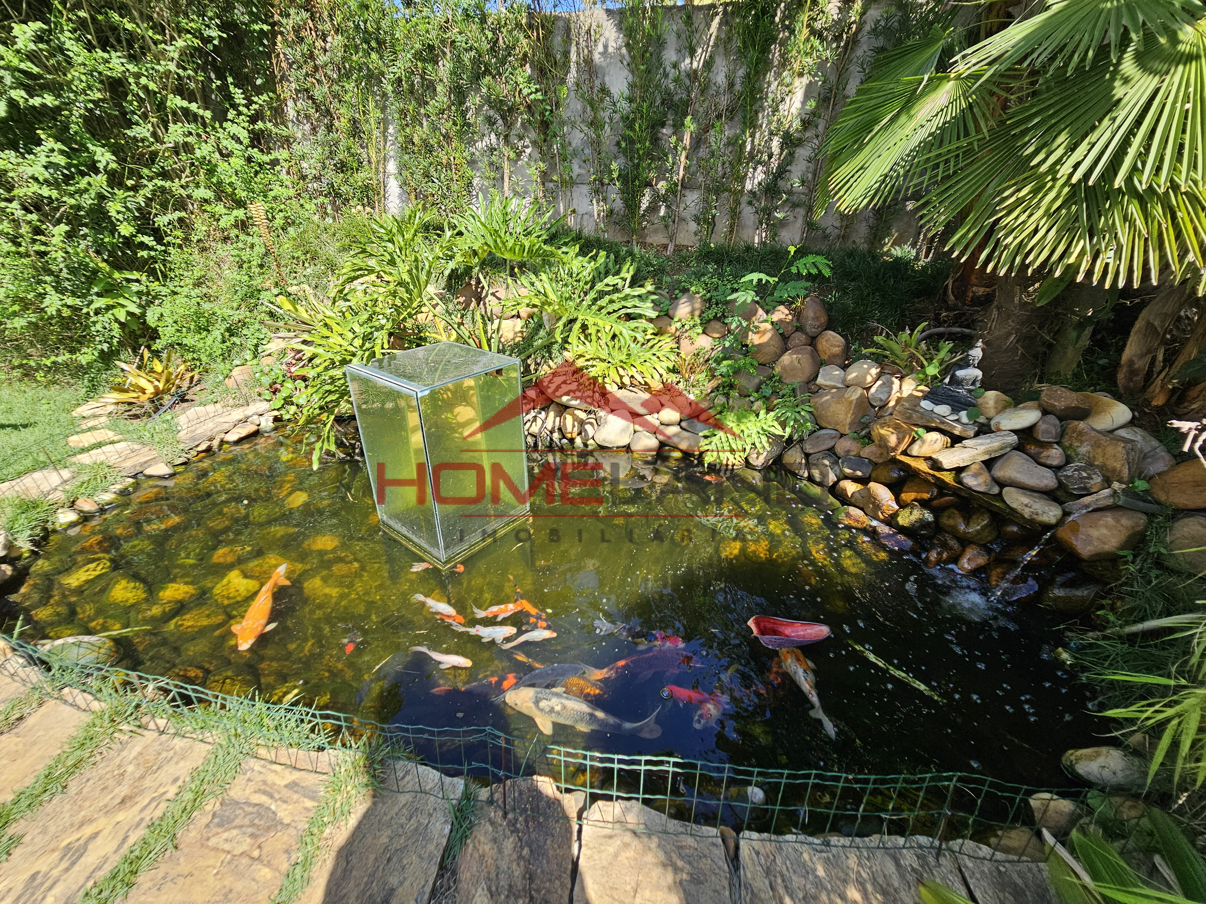 O pequeno lago com carpas adiciona um toque zen ao ambiente, proporcionando uma atmosfera tranquila e harmoniosa. A piscina, cercada por áreas verdes, é um convite para refrescantes momentos de lazer sob o sol.